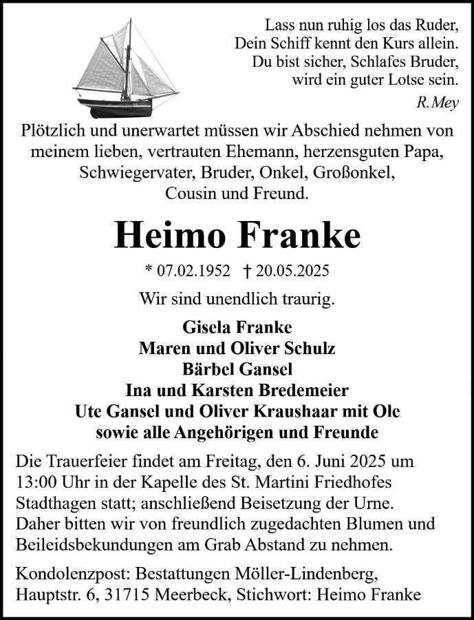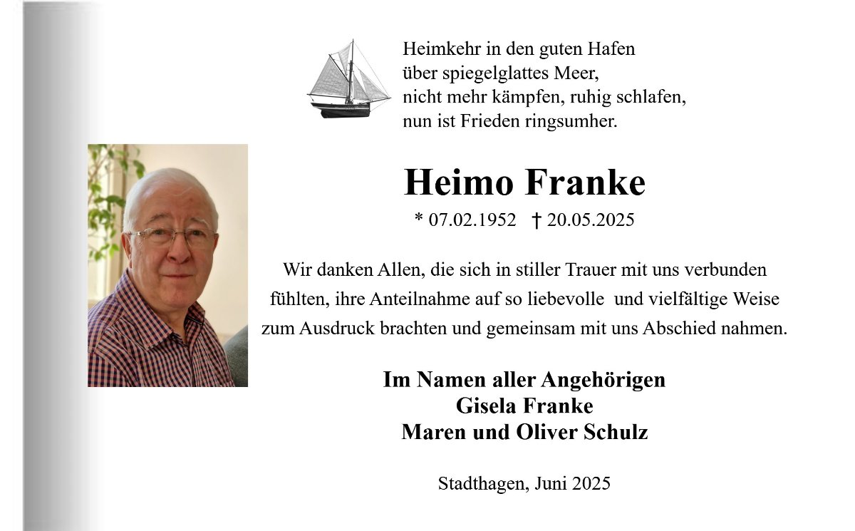 Ein ehrendes Andenken werden wir in uns bewahren und sind dankbar, dass Heimo uns sein Vertrauen, seine Sympathie und sein Lächeln geschenkt hat.